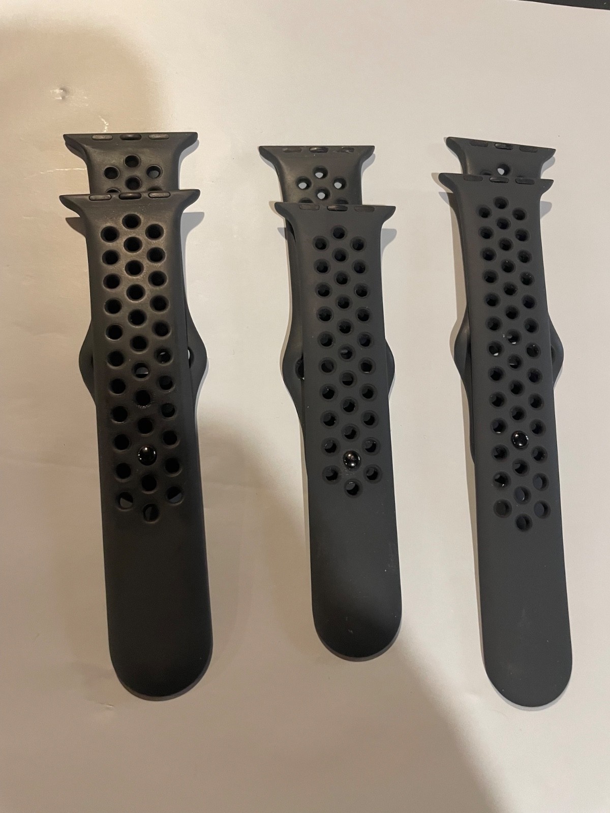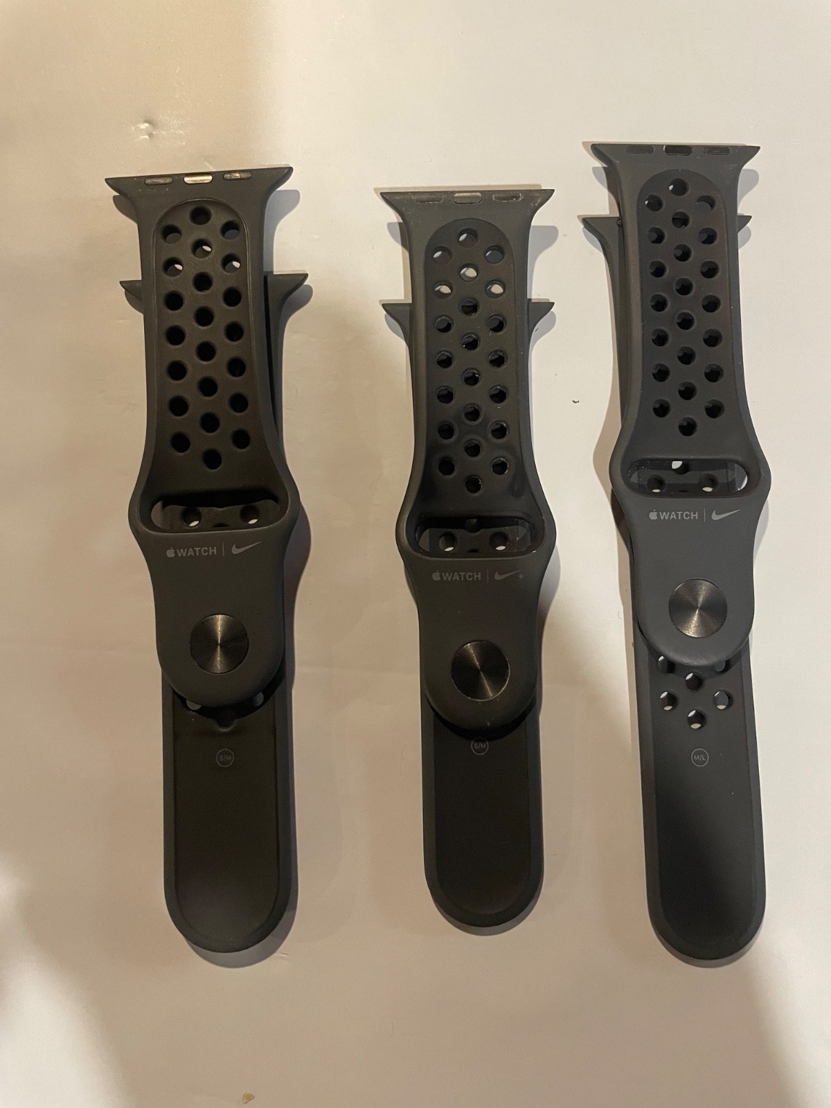 Lot of 3 Lot of 3 Genuine Apple Watch Nike Sport Band Strap (2 S/M, 1 M/L) Size 42,44,45. What you see in the picture is exactly what you will receive. 3 qty watch bands Used condition with mark/scuffs